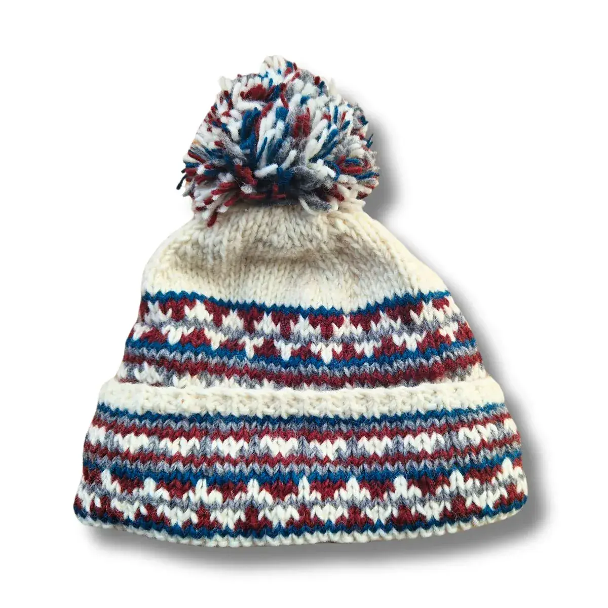 Scandi style bobble hat with a fold-up brim and chunky bobble. Available in 2 colourways, this warm and cosy wool hat has been hand knitted in Nepal.