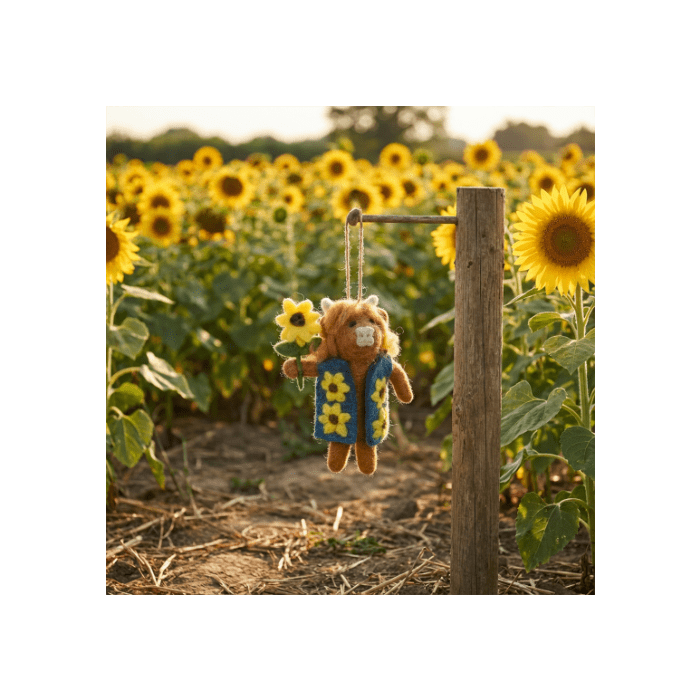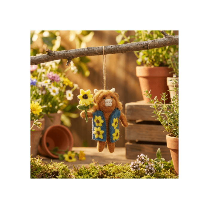 ntroducing Harrison the Highland Cow, the bonniest bovine on the block! This needle felted decoration is a moo-st-have for all cow enthusiasts with a taste for floral fashion. Perfect for the spring season, Harrison is here to sprinkle your space with laughter and charm, one sunflower at a time. His fluffy wool expertly crafted into a lifelike masterpiece, paired with his gorgeous needle felted waistcoat adorned with matching sunflowers to the one stitched into his hoof makes Harrison a truly perfect little decoration. Harrison has been handcrafted in The Himalayas under fair trade working conditions and is naturally plastic-free and biodegradable.