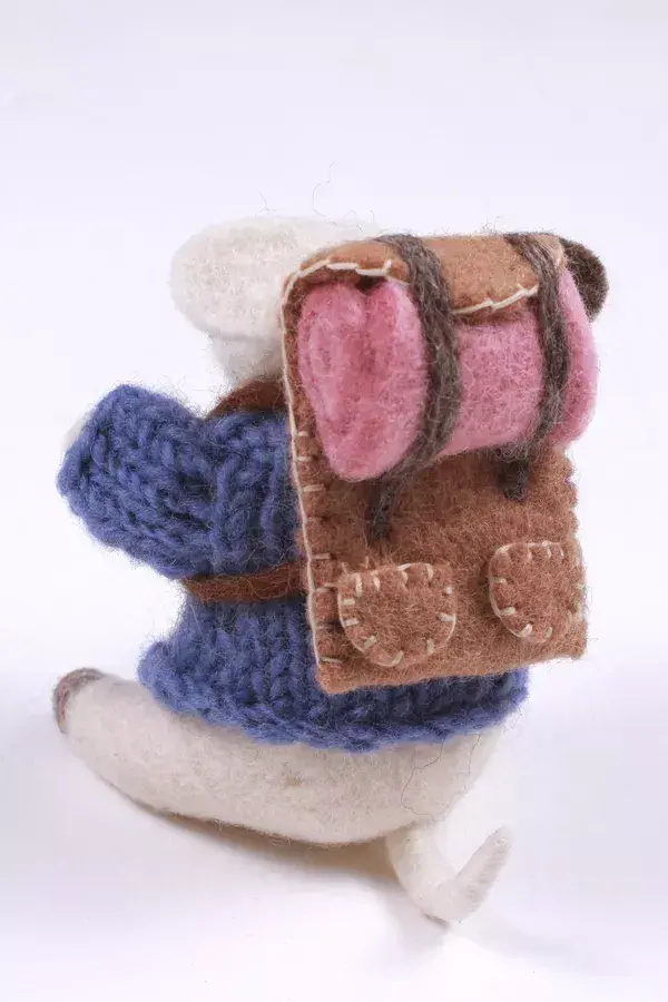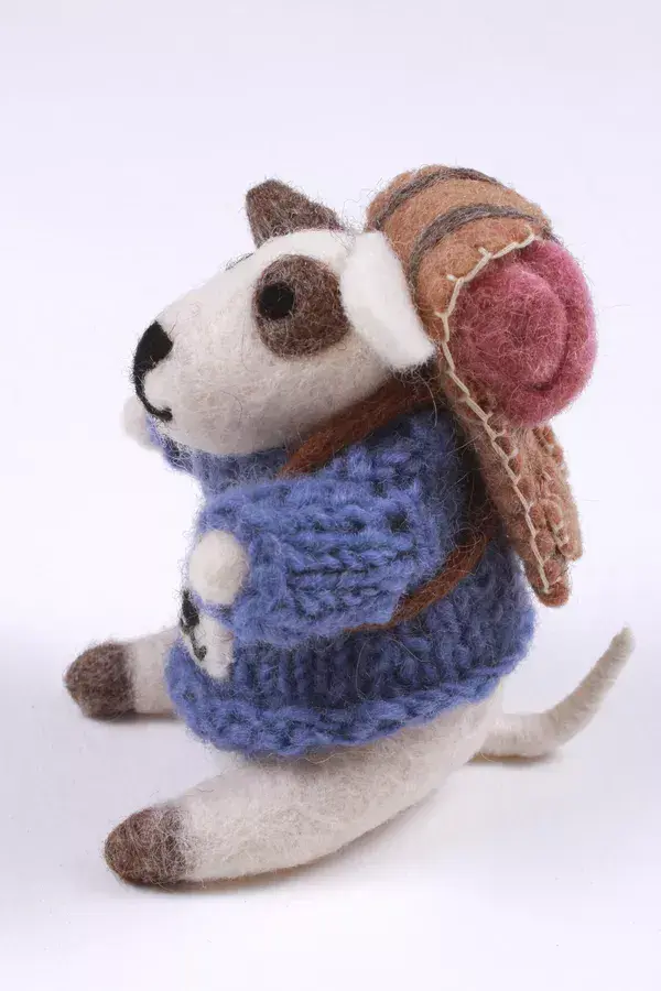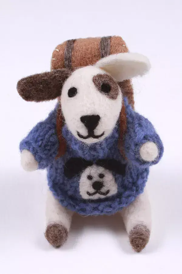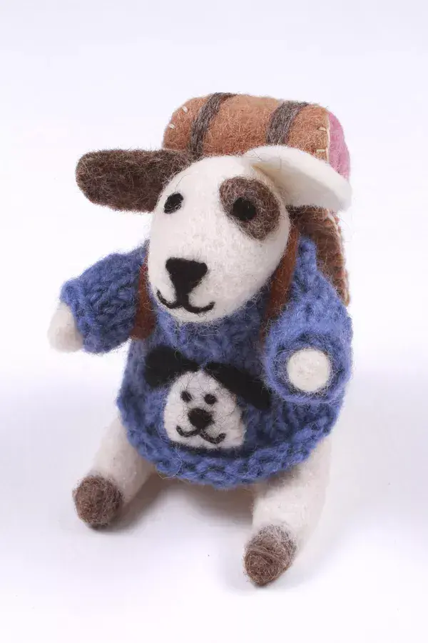 Hand felted wool ornament. Cute little dog ready for a day of walking. Handmade and Fair trade in Nepal.