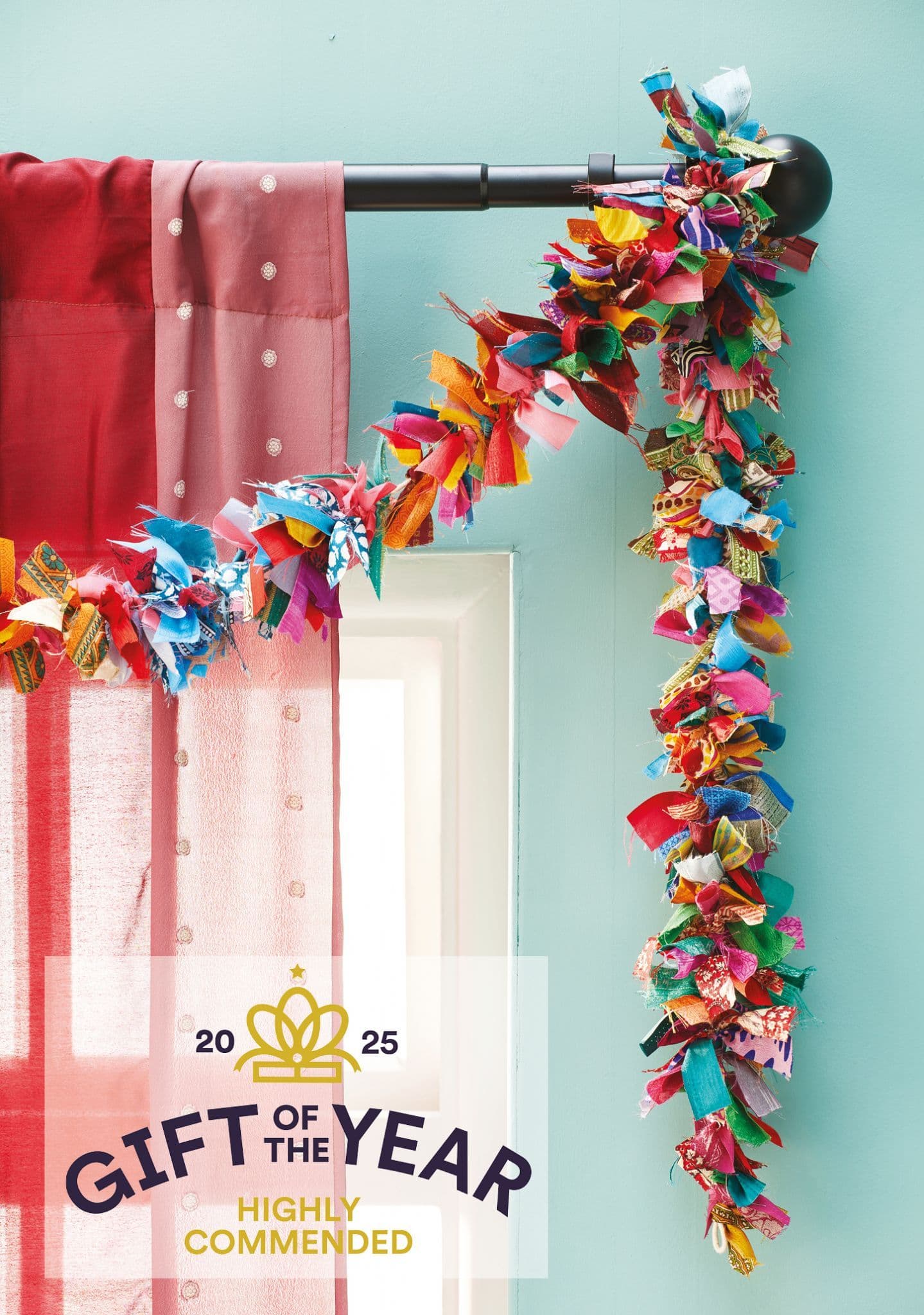A gorgeous multi coloured garland of recycled sari fabric tinsel to display for celebratory occasions. The funky fabric strands extend all around, making it simple to create 'wow' room designs and a personalised individual space. Use the end hanging loops to hang horizontally or vertically. Experiment by layering with other colours in the range for eye-catching decor all year round. Enjoy these sustainable, eco friendly and versatile decorations.